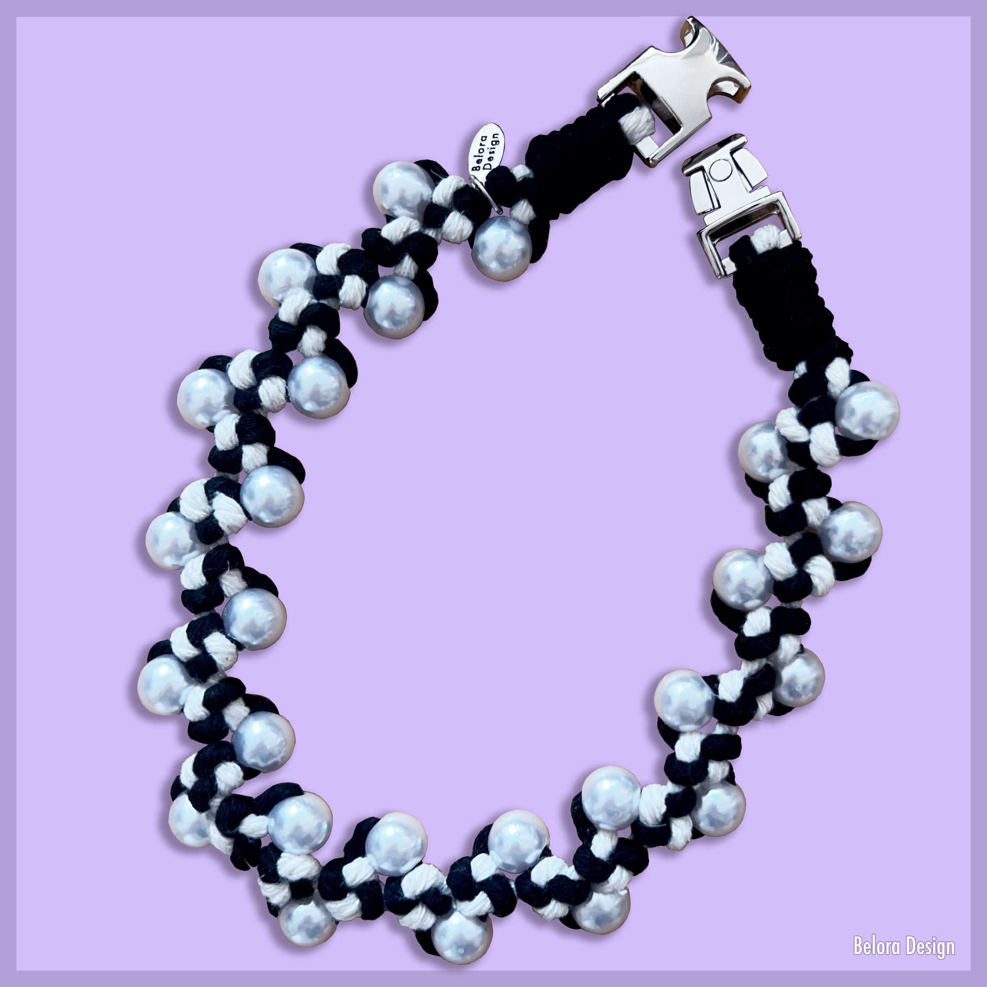 Elevate your pet’s style with Midnight Pearl, a handcrafted necklace made with traditional knotting techniques in black and white cords, adorned with luminous pearls. This design blends timeless craftsmanship with modern elegance, making it a true statement piece.